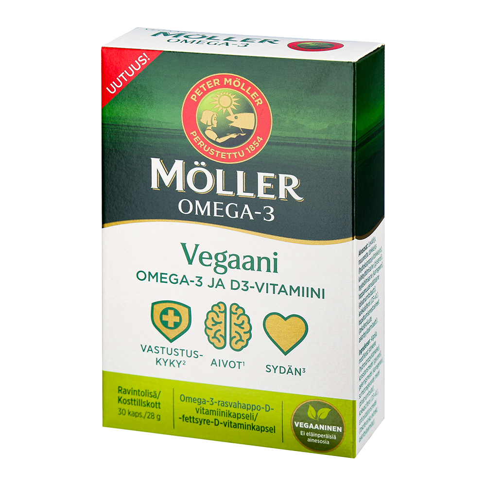 Innovatiivinen Möller Vegaani Omega-3 + D3-vitamiini tarjoaa toivotun vegaanisen vaihtoehdon tärkeille omega-3-rasvahapoille.